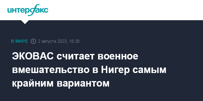 Москва. 2 августа. INTERFAX.RU - В Экономическом сообществе западноафриканских государств (ЭКОВАС) заявили, что могут прибегнуть к военному вмешательству в ситуацию в Нигере только в крайнем случае, пишет Le Figaro.