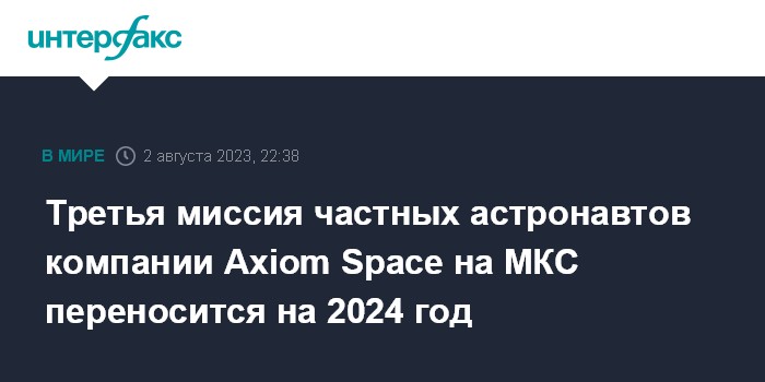 Москва. 2 августа. INTERFAX.RU - Третья миссия частных астронавтов на Международной космической станции (МКС) американской компании Axiom Space переносится с конца 2023 на начало 2024 года, сообщило в среду Национальное управление США по аэронавтике и исследованию космического пространства (NASA).