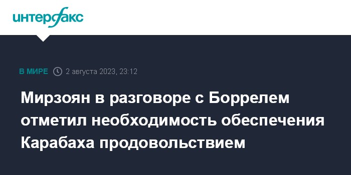 "Мирзоян и Боррель обменялись мнениями по вопросам региональной безопасности. Был обсужден гуманитарный кризис в Нагорном Карабахе, ежедневно усугубляющийся из-за незаконного блокирования Азербайджаном Лачинского коридора", - сообщает пресс-служба МИД Армении.