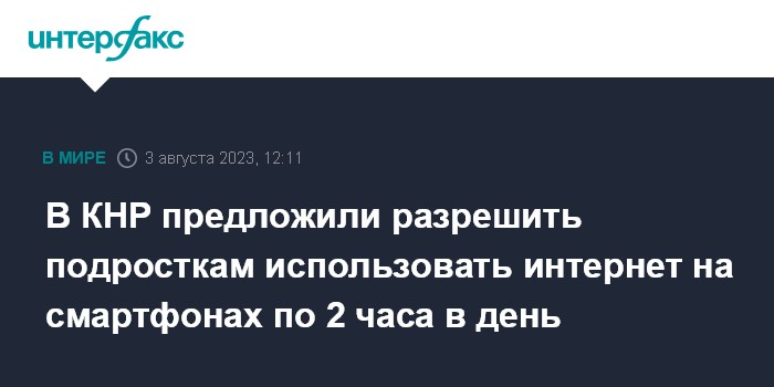 Государственная канцелярия интернет-информации КНР (САС) опубликовала проект правил, по которым несовершеннолетним будет запрещено использовать большинство сервисов на мобильных устройствах с 22:00 до 6:00, а подросткам в возрасте от 16 до 18 лет разрешат выходить в интернет со смартфона только два часа в день.