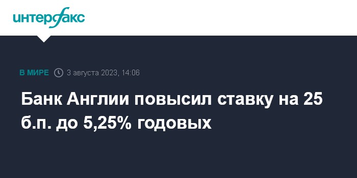 Москва. 3 августа. INTERFAX.RU - Банк Англии по итогам августовского заседания принял решение повысить базовую процентную ставку на 25 базисных пунктов до 5,25% годовых.