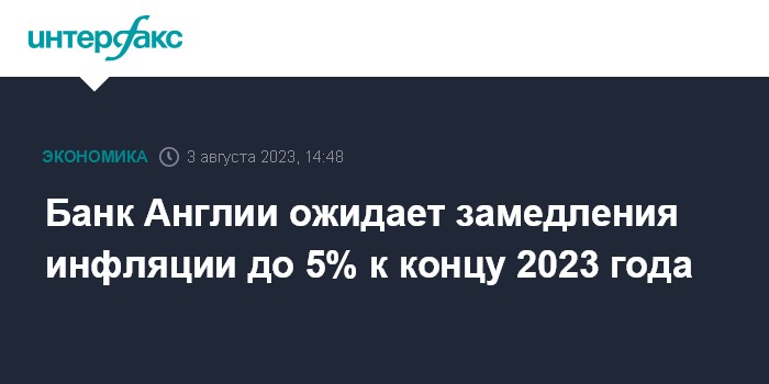 Москва. 3 августа. INTERFAX.RU - Банк Англии прогнозирует существенное замедление темпов роста потребительских цен в Великобритании к концу 2023 года - до примерно 5%, говорится в коммюнике регулятора.