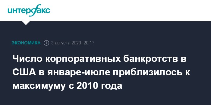 Москва. 3 августа. INTERFAX.RU - Количество банкротств американских компаний в январе-июле 2023 года достигло 402, что является максимальным значением для этого периода с 2010 года, не считая ковидного 2020 года, говорится в отчете S&P Global Market Intelligence.