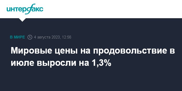Москва. 4 августа. INTERFAX.RU - Мировые цены на продовольствие, снижавшиеся в мае и июне, в июле по сравнению с предыдущим месяцем выросли на 1,3%. Об этом сообщается в очередном обзоре ФАО (продовольственная и сельскохозяйственная организация ООН).