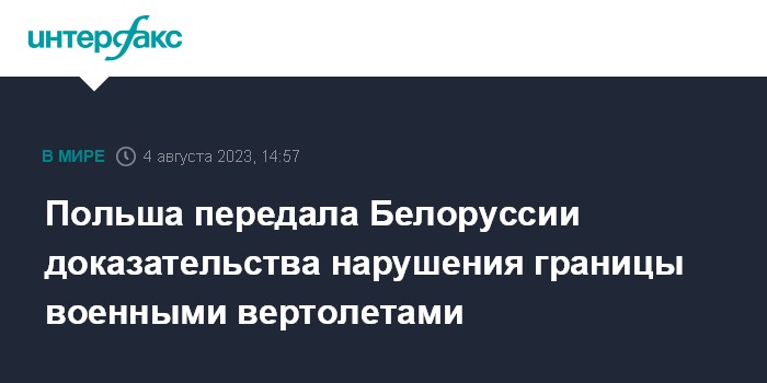 "4 августа посольство республики Польша в Минске предоставило министерству иностранных дел республики Беларусь подробную информацию, убедительно подтверждающую факт нарушения 1 августа 2023 года воздушного пространства Польши двумя белорусскими военными вертолетами, - заявила Варшава. - Представленные данные противоречат позиции Республики Беларусь, выраженной в официальных сообщениях белорусских МИД и Минобороны".