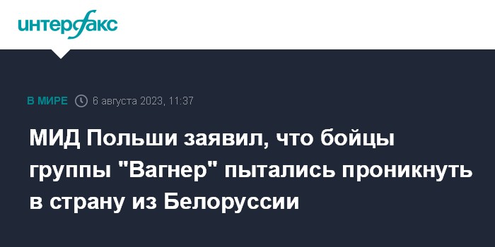Москва. 6 августа. INTERFAX.RU - Замглавы МИД Польши Павел Яблонский в интервью CNN заявил, что бойцы группы "Вагнер" пытались проникнуть с территории Белоруссии в Польшу, рассматривается возможность полностью закрыть польско-белорусскую границу.