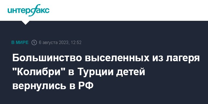 2 августа российские дети, отдыхавшие в лагере "Колибри" в Турции, были выселены из отеля до окончания действия путевок. Ночь они провели на улице, а затем их заселили в другой отель и пообещали 5 августа отправить в Россию. Организатор лагеря заявил "Интерфаксу", что дети заехали в отель 19 июля и должны были выехать 9 августа, но их перевели в другой отель из-за овербукинга. Он пообещал, что 5 августа для них будет организован вылет в Россию.
