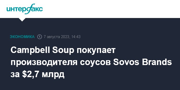 Москва. 7 августа. INTERFAX.RU - Американский производитель продуктов питания Campbell Soup Co. договорился о покупке конкурирующей Sovos Brands Inc. за $2,7 млрд.