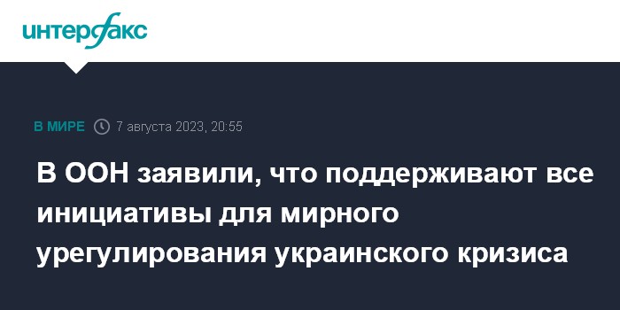 Москва. 7 августа. INTERFAX.RU - ООН выступает за любые мирные инициативы для урегулирования кризиса с Украиной и достижения мирного соглашения на основе Устава ООН, сообщил в понедельник представитель генсека ООН Фархан Хак.