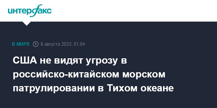 Москва. 8 августа. INTERFAX.RU - Совместное патрулирование кораблей ВМФ РФ и ВМС КНР в акватории Тихого океана не представляет угрозу США, заявил пресс-секретарь Пентагона Патрик Райдер.