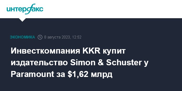 Москва. 8 августа. INTERFAX.RU - Инвесткомпания KKR купит издательство Simon & Schuster у Paramount Global за $1,62 млрд. Сделка будет полностью оплачена денежными средствами, сообщается в пресс-релизе Paramount.
