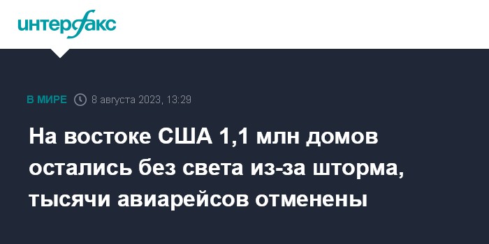 Москва. 8 августа. INTERFAX.RU - Свыше 1,1 млн жилых домов и предприятий остались без электричества после мощного шторма, обрушившегося на восток США, сообщают американские СМИ.