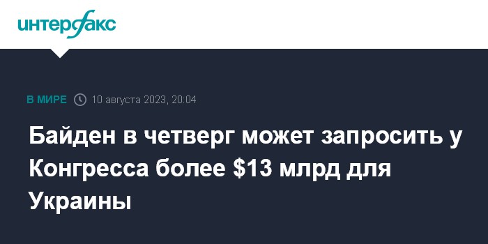 Москва. 10 августа. INTERFAX.RU - Президент США Джо Байдена в четверг направит в Конгресс запрос о выделении еще более $13 млрд для экстренной помощи Украине, сообщает Associated Press (AP) со ссылкой на источник.