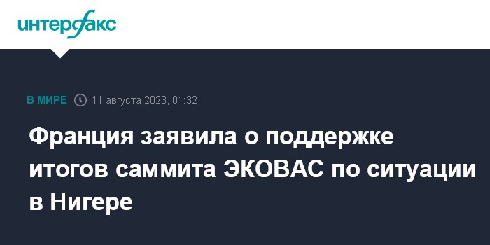 Москва. 11 августа. INTERFAX.RU - Министерство иностранных дел Франции распространило заявление, в котором выражена поддержка решений Экономического сообщества стран Западной Африки (ЭКОВАС) в связи с военным переворотом в Нигере.