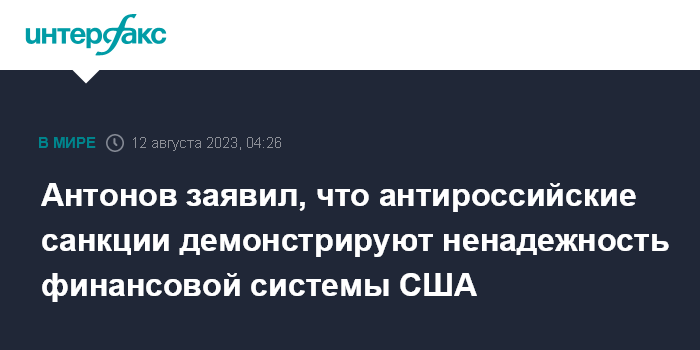Антонов заявил, что антироссийские санкции демонстрируют ненадежность финансовой системы США