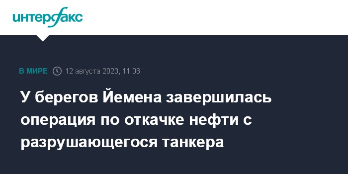 Москва. 12 августа. INTERFAX.RU - Операция по перекачке нефти с аварийного танкера FSO Safer, пришвартованного в Красном море у побережья Йемена, завершена, сообщает в субботу The Guardian.