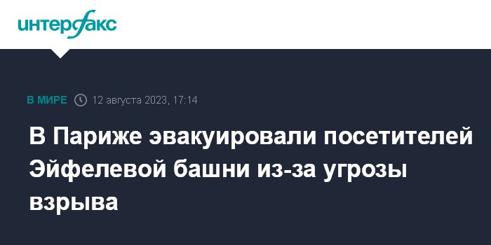 Москва. 12 августа. INTERFAX.RU - Три этажа Эйфелевой башни были эвакуированы в субботу из-за сообщения о заложенной бомбе, передают французские СМИ.