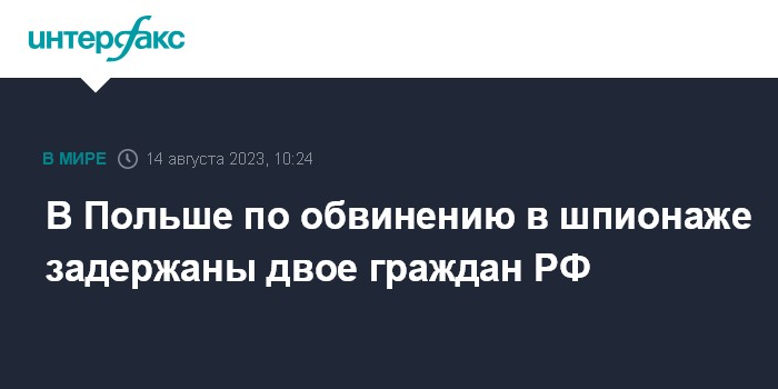 Москва. 14 августа. INTERFAX.RU - Сотрудники Агентства внутренней безопасности Польши по обвинениям в шпионаже задержали двух россиян, сообщил в понедельник в твиттере глава польского МВД Мариуш Каминьский.