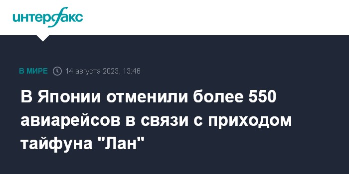 Москва. 14 августа. INTERFAX.RU - Японские авиакомпании отменили свыше 550 авиарейсов в связи с приближением мощного тайфуна "Лан", который во вторник должен достичь тихоокеанского побережья западной Японии, сообщает в понедельник "Киодо".