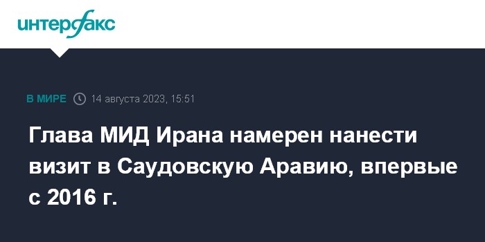 Москва. 14 августа. INTERFAX.RU - Глава МИД Ирана Хосейн Амир Абдоллахиан, как ожидается, 17 августа, посетит с визитом Саудовскую Аравию, спустя семь лет после разрыва дипотношений между двумя странами сообщили в понедельник иранские СМИ.