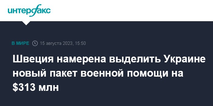 Москва. 15 августа. INTERFAX.RU - Шведские власти собираются выделить Украине очередной пакет военной помощи на сумму в $313 млн, сообщают во вторник западные СМИ со ссылкой на главу Минобороны Швеции Пола Йонсона.