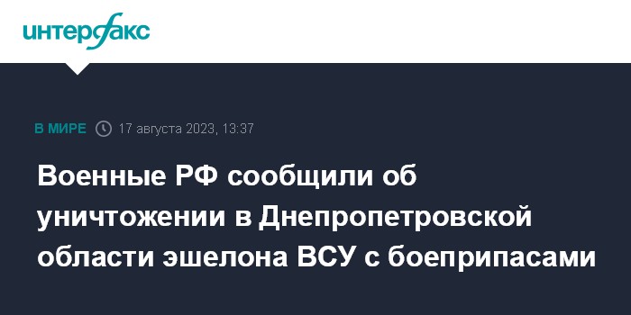 Москва. 17 августа. INTERFAX.RU - Российские военные нанесли удар по воинскому эшелону с боеприпасами вооруженных сил Украины (ВСУ) на станции Межевая в Днепропетровской области, заявил официальный представитель Минобороны РФ Игорь Конашенков.