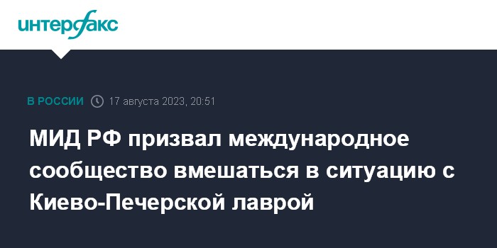 Москва. 17 августа. INTERFAX.RU - МИД РФ призывает отменить блокаду Киево-Печерской лавры, отмечая, что международное сообщество должно срочно вмешаться в ситуацию, сообщается на сайте российского внешнеполитического ведомства.