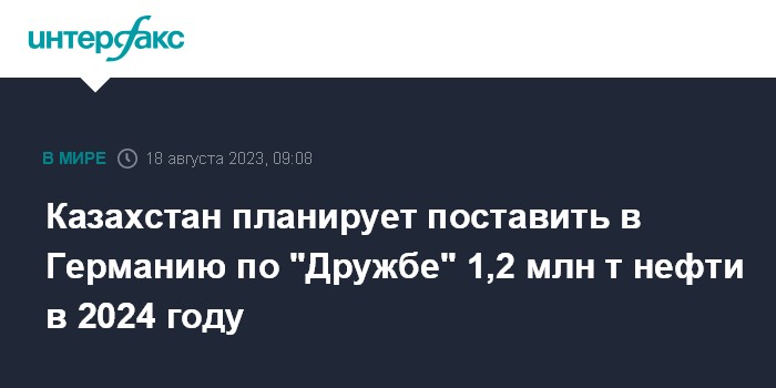 Казахстан запланировал в августе текущего года поставить в Германию по нефтепроводу "Дружба" 100 тыс. тонн нефти из ресурсов компании "Карачаганак Петролеум Оперейтинг Б.В.". По данным Минэнерго, в период с 3 по 5 августа 2023 года на нефтеперекачивающую станцию "Большой Чаган" была принята нефть в количестве 11,6 тыс. тонн, остальной объем будет принят с 6 по 29 августа.