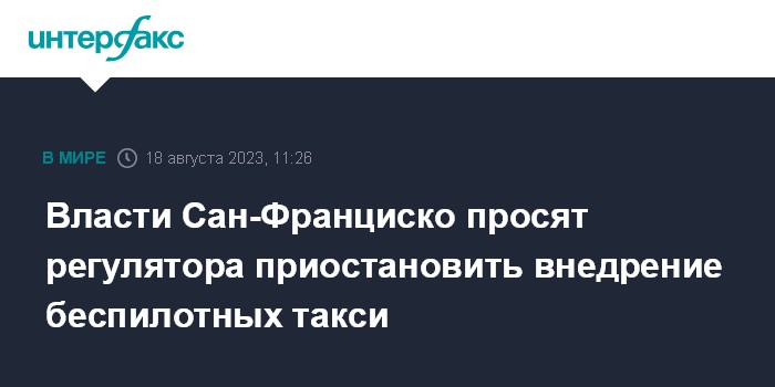 Москва. 18 августа. INTERFAX.RU - Власти Сан-Франциско обратились к калифорнийскому регулятору с просьбой приостановить действие выданного ранее расширенного разрешения на эксплуатацию роботакси в городской черте, сообщает MarketWatch.
