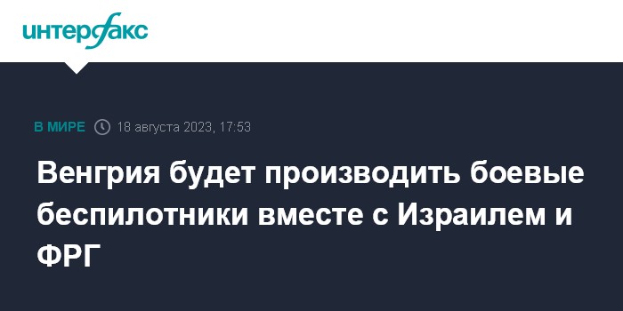 Москва. 18 августа. INTERFAX.RU - Венгрия подписала соглашение о сотрудничестве с израильскими и германскими компаниями, с которыми она будет производить боевые беспилотники, заявил премьер-министр страны Виктор Орбан. Об этом сообщает АР.