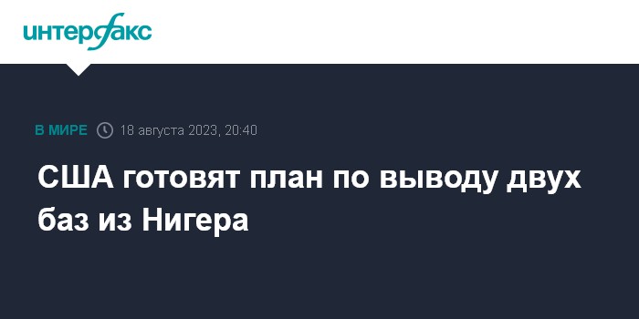 Москва. 18 августа. INTERFAX.RU - Военное командование США в порядке предосторожности готовит планы на случай, если потребуется проводить эвакуацию из Нигера двух баз, сообщает AP.