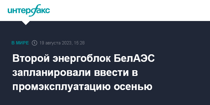 Москва. 19 августа. INTERFAX.RU - Второй энергоблок БелАЭС планируется осенью этого года ввести в промышленную эксплуатацию, сообщил в субботу заместитель министра энергетики Белоруссии Михаил Михадюк.