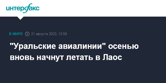 Москва. 21 августа. INTERFAX.RU - Авиакомпания "Уральские авиалинии" с 28 октября возобновляет чартерные рейсы из Владивостока во Вьентьян (столица Лаоса) и начнет осуществлять полеты по этому направлению из Новосибирска.