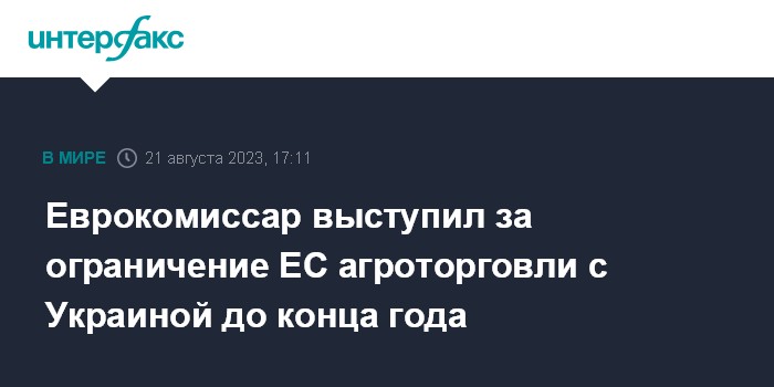 Москва. 21 августа. INTERFAX.RU - Евросоюзу следует продлить истекающий 15 сентября запрет на импорт украинской агропродукции пятью соседними с Украиной странами по меньшей мере до конца 2023 года, считает еврокомиссар по сельскому хозяйству Януш Войцеховский.