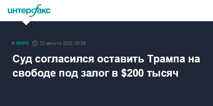 Москва. 22 августа. INTERFAX.RU - Суд в штате Джорджия согласился оставить экс-президента США Дональда Трампа, обвиняемого во вмешательстве в президентские выборы 2020 года, на свободе под залог в $200 тысяч, сообщают СМИ.