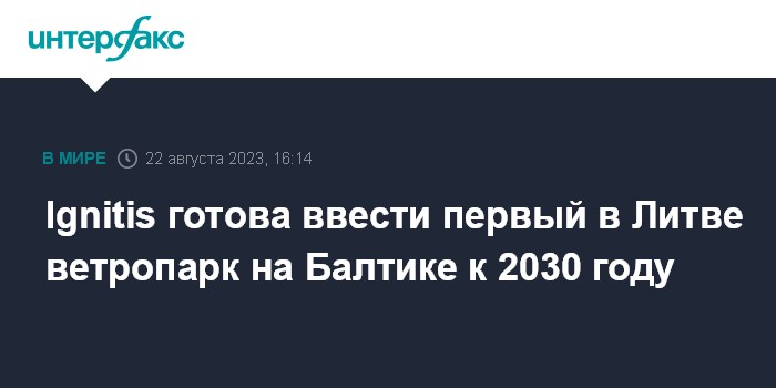 Москва. 22 августа. INTERFAX.RU - Государственная компания Ignitis grupe в случае победы в тендере планирует начать строительство первого в Литве ветропарка в Балтийском море в 2026-2027 годах и завершить к 2030 году, сообщил инвесторам финансовый директор группы Йонас Римавичюс.