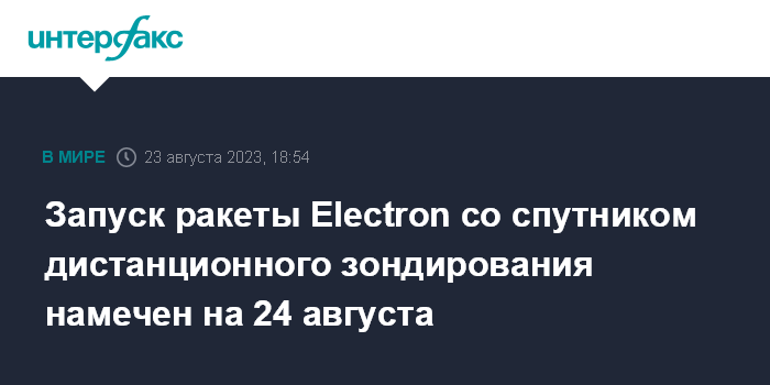 Москва. 23 августа. INTERFAX.RU - Американская ракета Electron будет запущена 24 августа из Новой Зеландии на орбиту со спутником дистанционного зондирования Земли (ДЗЗ) Acadia компании Capella Space, сообщила компания-разработчик носителя Rocket Lab.