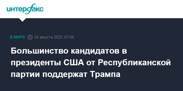 Москва. 24 августа. INTERFAX.RU - Большинство кандидатов на пост президента США от Республиканской партии на прошедших первых дебатах продемонстрировали готовность поддержать кандидатуру экс-президента Дональда Трампа, если он победит в партийной номинации на пост главы государства даже в том случае, если он будет признан виновным.