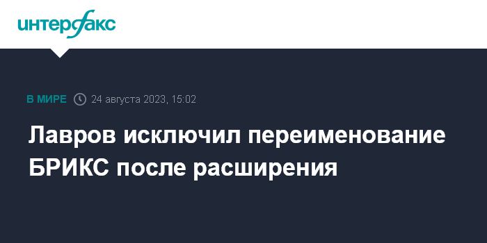 Москва. 24 августа. INTERFAX.RU - Название БРИКС после принятия в него новых стран менять не планируется, заявил на пресс-конференции в Йоханнесбурге глава МИД России Сергей Лавров.