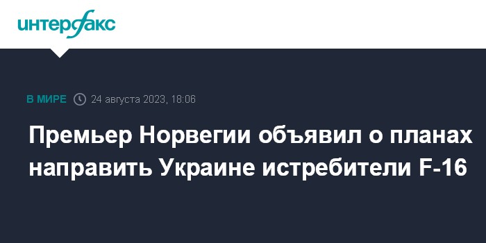 Москва. 24 августа. INTERFAX.RU - Премьер Норвегии Йонас Гар Стёре в четверг объявил о планах Осло направить Украине истребители F-16.