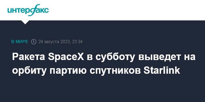 Москва. 24 августа. INTERFAX.RU - Ракета-носитель Falcon 9 в субботу по московскому времени стартует на орбиту с очередной партией из 22 мини-спутников для пополнения орбитальной группировки глобальной сети интернет-покрытия системы Starlink, сообщила компания-разработчик SpaceX.