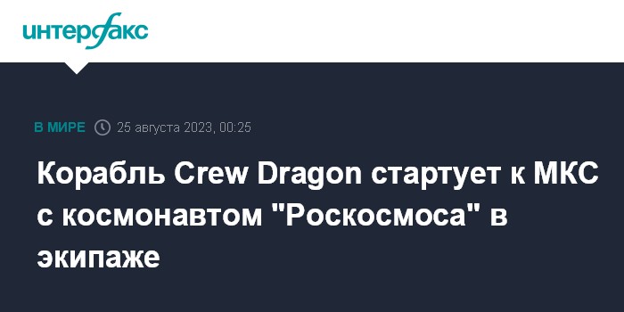 Москва. 25 августа. INTERFAX.RU - Американский многоразовый пилотируемый космический корабль Crew Dragon компании SpaceX в пятницу стартует к Международной космической станции (МКС) с тремя астронавтами и космонавтом "Роскосмоса" на борту, сообщает NASA.