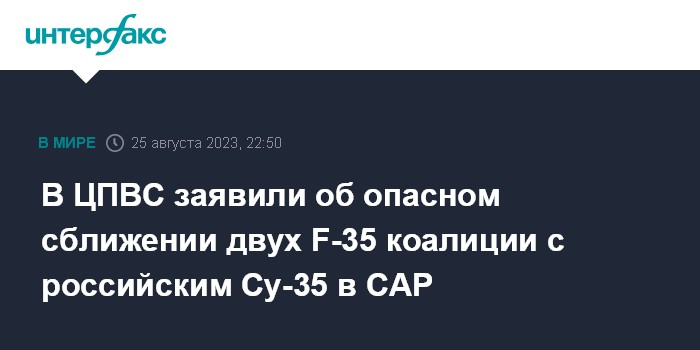 Москва. 25 августа. INTERFAX.RU - Два истребителя F-35 возглавляемой США международной коалиции допустили опасное сближение в Сирии с самолетом Су-35 ВКС России, летевшим вдоль южной границы страны, сообщил замруководителя российского Центра по примирению враждующих сторон (ЦПВС) в Сирийской Арабской Республике, контр-адмирал Вадим Кулить.