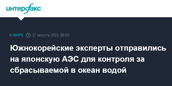 Москва. 27 августа. INTERFAX.RU - Три южнокорейских эксперта по ядерной безопасности отправились в воскресенье в Японию, чтобы контролировать сброс загрязненной воды с поврежденной АЭС "Фукусима-1", сообщило агентство "Ренхап" со ссылкой на источник из числа официальных лиц.