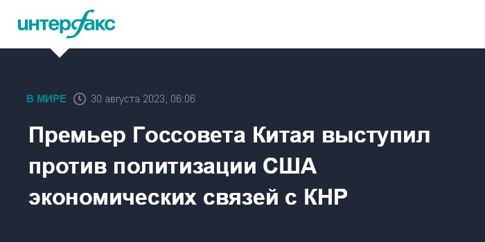 Москва. 30 августа. INTERFAX.RU - Премьер Госсовета Китая Ли Цян предупредил, что чрезмерная политизация Вашингтоном экономических связей с Китаем, выпячивание проблем нацбезопасности чреваты катастрофическими последствиями для мировой экономики, сообщило министерство коммерции КНР.