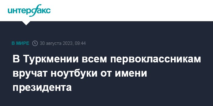 Москва. 30 августа. INTERFAX.RU - В новом учебном году школы Туркменистана примут 76 677 первоклассников, которым от имени президента Сердара Бердымухамедова подарят в День знаний ноутбуки для обучения, сообщают туркменские СМИ.