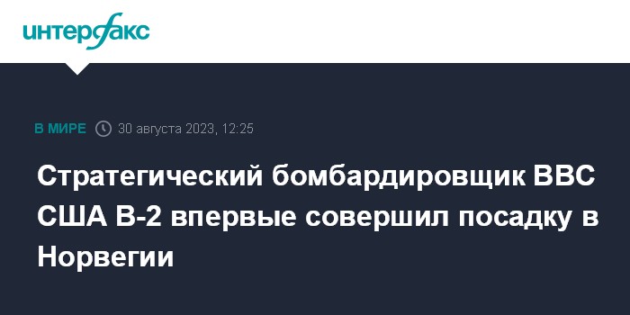 Москва. 30 августа. INTERFAX.RU - Американский стратегический стелс-бомбардировщик B-2 Spirit впервые совершил посадку в Норвегии, сообщает командование ВВС США в Европе.