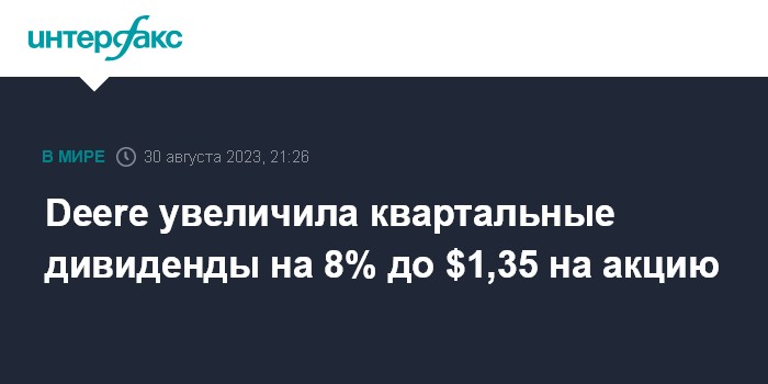 Москва. 30 августа. INTERFAX.RU - Совет директоров американской Deere & Co., крупнейшего в мире производителя сельхозоборудования, одобрил повышение квартальных дивидендов на 8% до $1,35 на акцию с $1,25 на акцию.