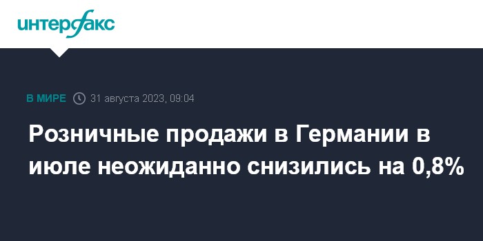 Москва. 31 августа. INTERFAX.RU - Розничные продажи в Германии в июле уменьшились на 0,8% относительно предыдущего месяца, сообщило Федеральное статистическое агентство страны (Destatis).