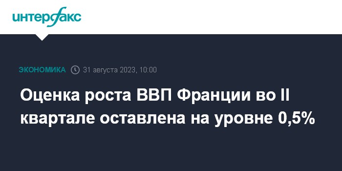 Москва. 31 августа. INTERFAX.RU - ВВП Франции во втором квартале 2023 года увеличился на 0,5% по сравнению с предыдущими тремя месяцами, по окончательным данным национального статистического института Insee.
